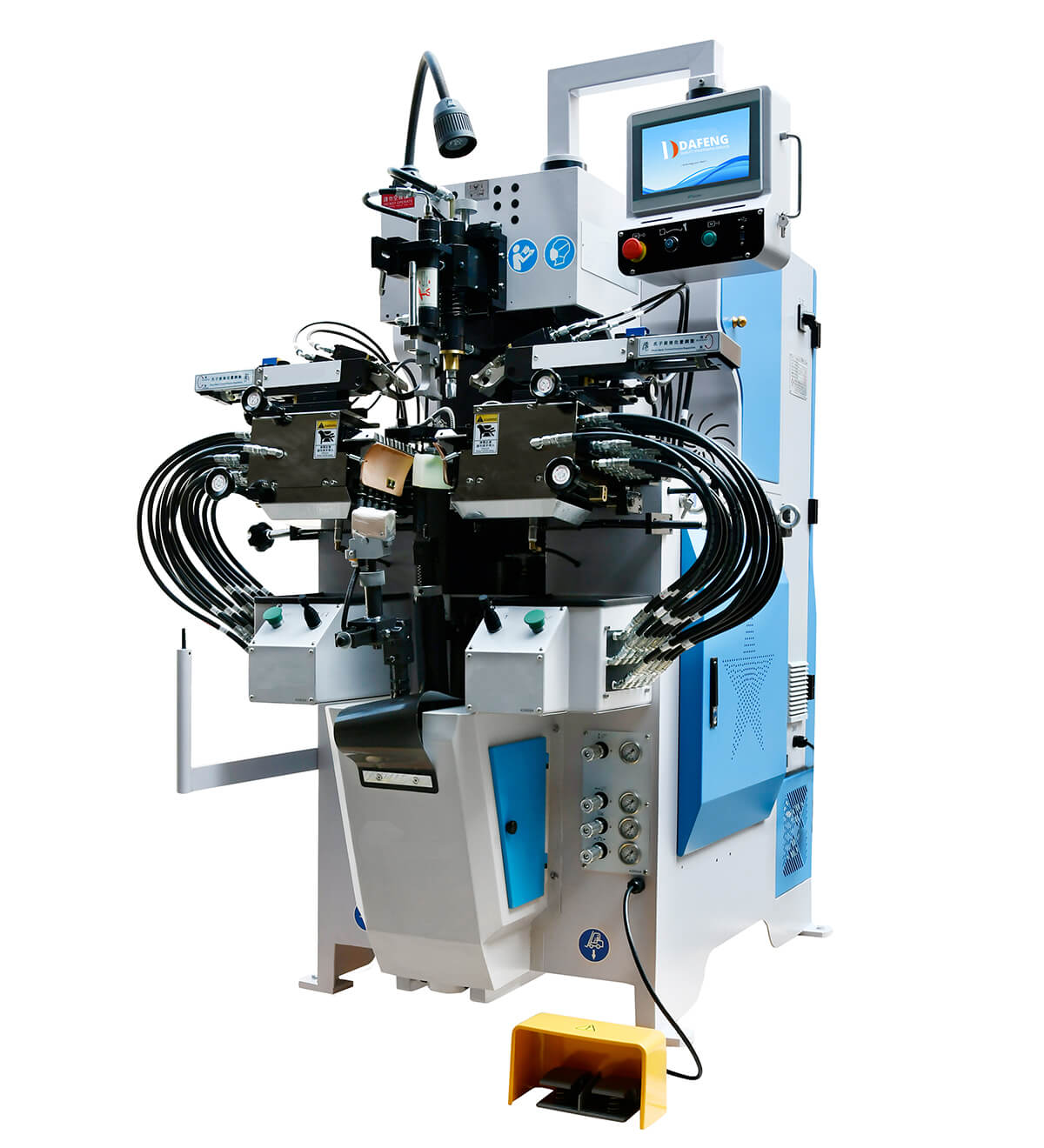 2. The machine adopts photoelectric induction and foot switch to control the pneumatic system to complete the complete set of last system. After putting the last into the positioning seat, the photoelectric induction sends a signal to the air cylinder for action, sends the tongue to the specified position, puts the upper into the working position, and steps down the foot switch. The pneumatic completes the last setting action according to the set time. The operation is simple and the efficiency is high.